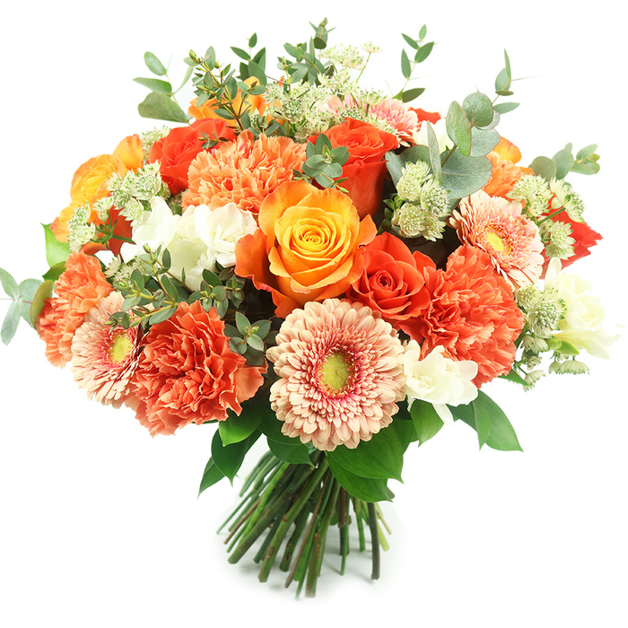Capture hearts with our Vibrant Elegance Bouquet, a delightful arrangement bursting with color and charm. This bouquet features orange and yellow roses, peach gerberas, and orange carnations, beautifully arranged with fragrant eucalyptus and fresh greenery.